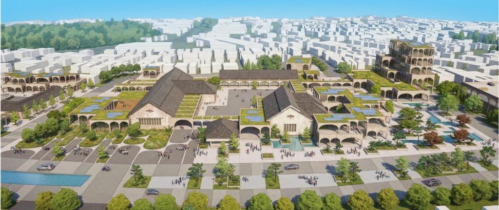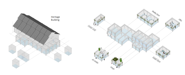 Gambar di atas merupakan visualisasi akhir pada tahap pengembangan rancangan yaitu menemukan  bentuk akhir final dari bangunan dan penataan kawasan untuk dapat dilanjutkan pada tahapan penyusunan  gembar kerja.