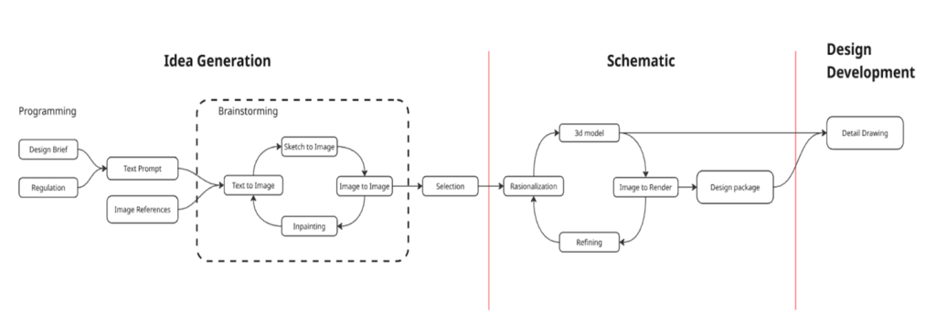 Dari gambar diatas,  AI telah masuk dalam 3 tahapan awal yang cukup   penting.  Pada Idea Generation merupakan tahap konsep rancangan, kehadiran AI membantu penggalian ide dan gagasan bentuk berdasarkan design brief (semacam KAK desain) dan berbagai pedoman regulasi terkait yang ada.  Berbagai pilihan bentuk dapat ditampilkan  melalui text to image, sketch to image maupun image to image.