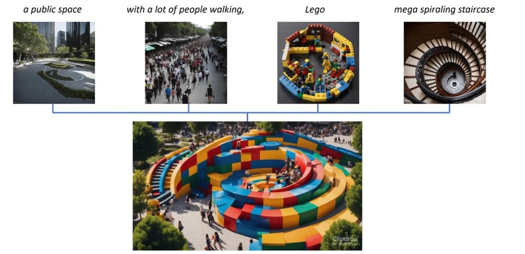 Gambar di atas merupakan contoh penerapan AI pada tahapan konsep rancangan melalui  text to image.  Model desain taman ruang publik  yang dihasilkan melalui perintah tertentu (prompt) susunan kata / kalimat  yaitu ruang terbuka publik, warga kota yang berjalan, bentuk mainan lego dan bentuk tangga spiral.