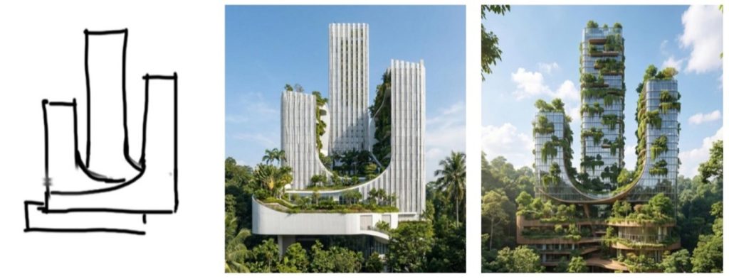 Contoh di atas, masih pada tahapan konsep rancangan dari  sebuah sketsa tangan dapat berubah menjadi model  visualisasi sesuai keinginan dengan memasukkan sejumlah prompt seperti kondisi lokasi, material, gaya arsitektur dan lainnya.