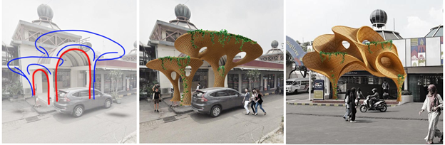 Gambar di atas merupakan Proposal Desain  Instalasi Gerbang Masuk (entrance) Blok M Hub Jakarta yang menggabungkan antara sketsa ide dan foto lokasi yang kemudian divisualisasikan dalam skematik desain dengan bantuan AI.