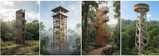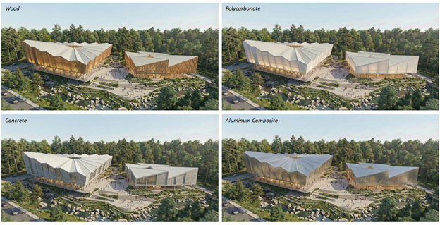 Gambar di atas,  memperlihatkan visualisasi desain penggunaan  berbagai material (kayu, beton, polycarbonate,  panil alumanium)  pada  tahapan pengembangan rancangan dengan tampilan 3 D dan simulasi rendering. Rendering sendiri merupakan proses penciptaan citra virtual dari desain dalam 3 Dimensi (warna, tekstur, pencahayaan) agar lebih detail dan realistis. Dengan AI, berbagai tampilan perubahan penggunaan material dapat dilakukan dengan cepat (dalam hitungan menit).