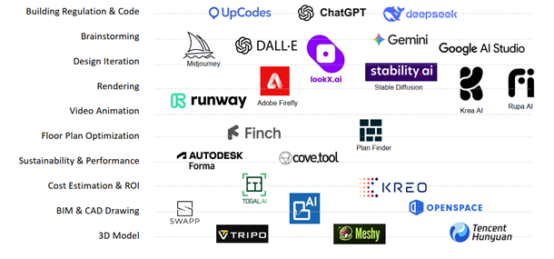 Tools AI untuk para arsitek sebagai alat bantu (assistance) sesuai fungsinya sudah cukup banyak dengan perkembangan varian / edisi yang begitu cepat. Seperti untuk tampilan image, tahun 2022  ada Midjourney V2 dan tahun 2025 muncul  aplikasi Nano Banana Pro. Untuk design research ada GPTs untuk arsitek,  kemudian  ada MCP (Model Context Protokol) yang  berfungsi sebagai lapisan / layer standarisasi untuk berbagai aplikasi AI yang digunakan agar dapat berkomunikasi secara efektif dengan layanan eksternal seperti alat, basis data, dan tempat yang telah ditentukan sebelumnya.   Selanjutnya beberapa tools AI untuk  arsitek seperti gambar berikut.