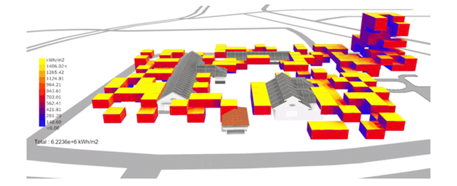 Gambar di atas ini adalah model analisis iklim mikro  (radiasi panas) bangunan dan kawasan dengan tools AI Galapagos yang mendukung desain bangunan berkelanjutan, seperti efisiensi energi, penetrasi cahaya alami dan penggunaan material.